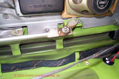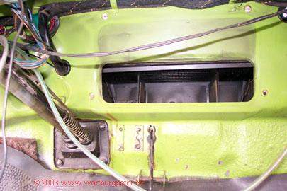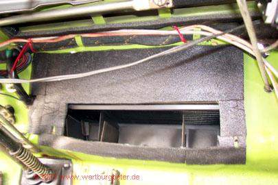 Wen wundert's, daß der Wartburg-Motor im Innenraum so gut zu hören ist? Die Spritzwand ist überhaupt nicht isoliert. Modernere Autos weisen hier eine dicke Schicht Dämmstoff verbunden mit einem festem Stück Pappe auf. |