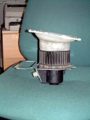 Gerade bin ich fertiggeworden. War ein ganz schönes Gebastele. Könnte sein, daß der Lüfterrotor noch ein wenig am Trichter schabt, aber dafür habe ich ein Stückel Schleifpapier mit doppelseitigem Klebeband. Das wird dann einfach auf den Rotor geklebt, und dann habe ich ganz schnell exakt eine Schleifpapierstärke Luft. Trotz Verstärkung ist die ganze Geschichte immer noch ein wenig lavede. Ich glaube langsam, daß die günstigste Variante die wäre, das ganze aus Alu zu replizieren.