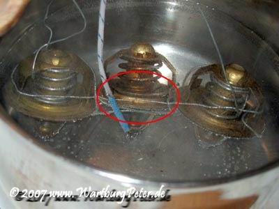 Bei 85°C ist im Wasser nichts zu erkennen, aber man kann den Eintopf ruhig heben, um zu kontrollieren. Die beiden äußeren Thermostaten sind etwa 3mm weit offen, der vom Camping hat schon volle 6mm.