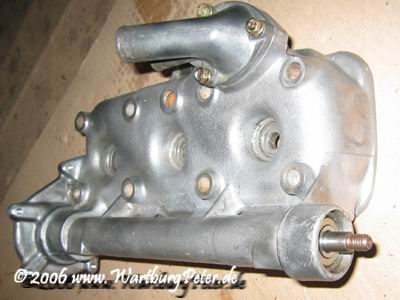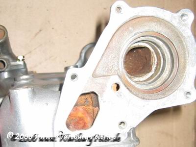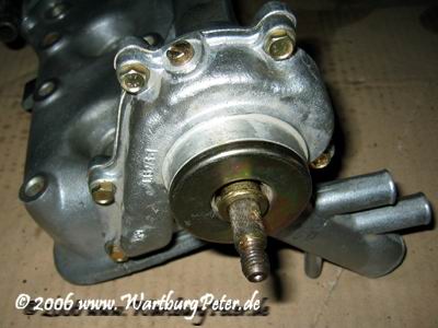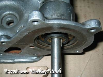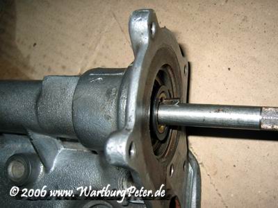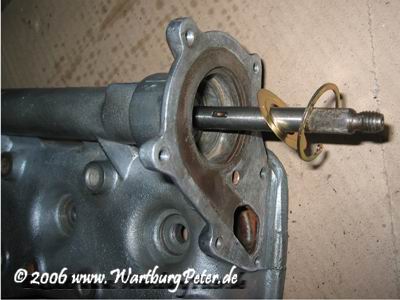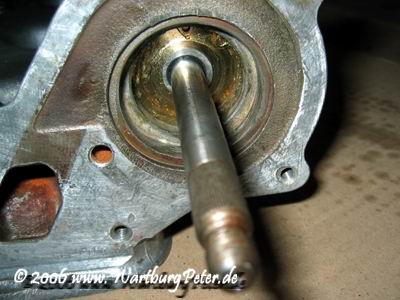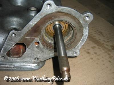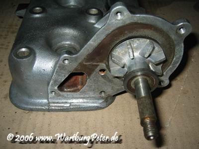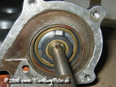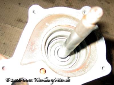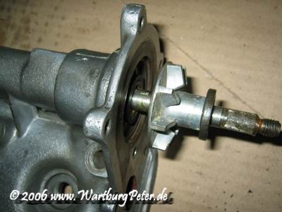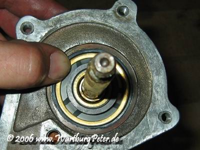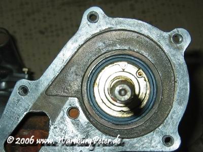 Leider ist der Sicherungsring nur zu erreichen, wenn das Schaufelrad und die Dichtung fehlen. Meiner Ansicht nach eine nicht sonderlich durchdachte Lösung. Ein von außen zugänglicher Paßstift hätte sicher auch geholfen... |