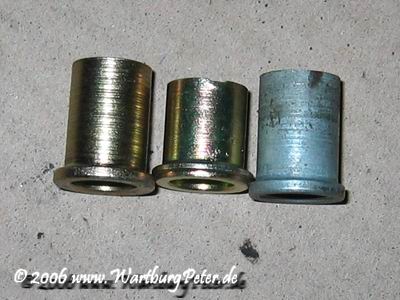 Nun muß die Distanzhülse aufgesteckt werden. Nicht verwechseln, beim Baumuster bis 1985 (also mit Lüfterrad), kommen 2 Hülsen zum Einsatz: die kürzere (mitte) befindet sich Lagerseitig, die Längere kommt zuletzt Lüfterseitig dran. Hier im Vergleich. Die Hülse wird innen und außen leicht eingefettet (SWS343). Der Ring an der Hülse zeigt in Richtung Lager. |