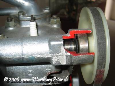 Nun schiebt man das Wasserpumpenrad auf die leicht gefettete Welle. Man kann der Gleitdichtung die Arbeit etwas erleichtern, wenn man einen Tropfen Graphitpaste auf die Dichtfläche bringt.