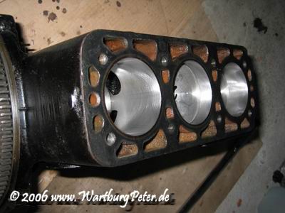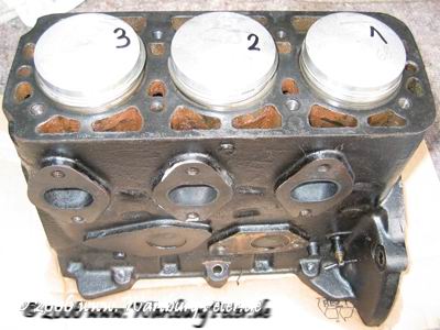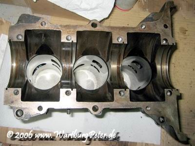 Das Einfädeln der gut geölten Kolben in die geölten Zylinder beginnt man mit dem mittleren Kolben. Hierfür sollte man sich etwas Zeit und einen Helfer mit kräftigen Armen nehmen. Die Kolbenringe drückt man, sofern kein Werkzeug für die Ringe vorhanden ist, mit spitzen Fingern zusammen. Das Einfädeln ist einfach. Vorsichtig "schnackelt" man die Kolben dabei etwas hin und her, bis sie von allein in den Zylinder rutschen. Die Kurbelwelle ist entsprechend nachzuführen. Ein verkanten der Kolben ist zu vermeiden. Kolbenringe sind hart wie Glas und brechen schnell, wenn sie verkanten. Ersatz ist kaum kurzfristig aufzutreiben und man kann nicht beliebige Ringe verwenden. Lieber zieht man die Kolben noch einmal zurück und fängt von vorn an. |