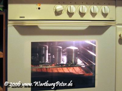 Da die Kolben neu und trocken sind (also nicht riechen), habe ich die Methode Backofen vorgezogen. Eventuell sollte man das erst machen, wenn die bessere Hälfte außer Haus ist, um den häuslichen Frieden nicht zu gefährden. (Also etwas unterlegen und die Kolben nicht mit der nackten Hand anfassen, da sie ab 40°C immer schwerer werden... Als Rechtshänder nimmt man die Kolben per Handschuh gleich so in die linke Hand, das sie nicht mehr hin und her gedreht werden müssen. Alles muß schnell gehen, weil die Kolben rasch auskühlen. |
