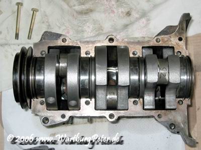 Die Kurbelwelle und vor allem ihre ebenfalls geölten Dichtringe neben den Lagern in der Mitte sind auf korrekten Sitz zu prüfen. Man versieht die Dichtfläche mit entsprechender Dichtmasse (jeweilige Anweisung dazu beachten) und kann nun das Unterteil aufschrauben. Reihenfolge und Anzugsmomente der Schrauben finden sich, wenn noch nicht geschehen, in Kürze auf meiner Homepage. |