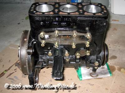 Bevor die Schwungscheibe montiert werden kann, ist das nicht übertrieben gefettete Nadellager für die Getriebeabtriebswelle einzusetzen. Die Schwungscheibe muß wieder in die markierte Richtung (Kolben 1 im OT) gebracht werden, bevor sie verschraubt und gesichert wird. Im weiteren sind dann die Kupplung zu montieren. Ein Zentrierdorn ist hier nicht zwingend erforderlich. Man kann sich auf seinen Tastsinn und Auge verlassen. Ab jetzt kann der Motor direkt im Wartburg plaziert weiter vervollständigt werden. Ebenso kann er vollständig außerhalb des Autos komplettiert werden. Die ersten Kurbelwellenumdrehungen per Hand gehen noch etwas schwer (nicht ohne zu ölen drehen --> Zweitaktöl). Doch dann läuft alles bald recht leicht. |