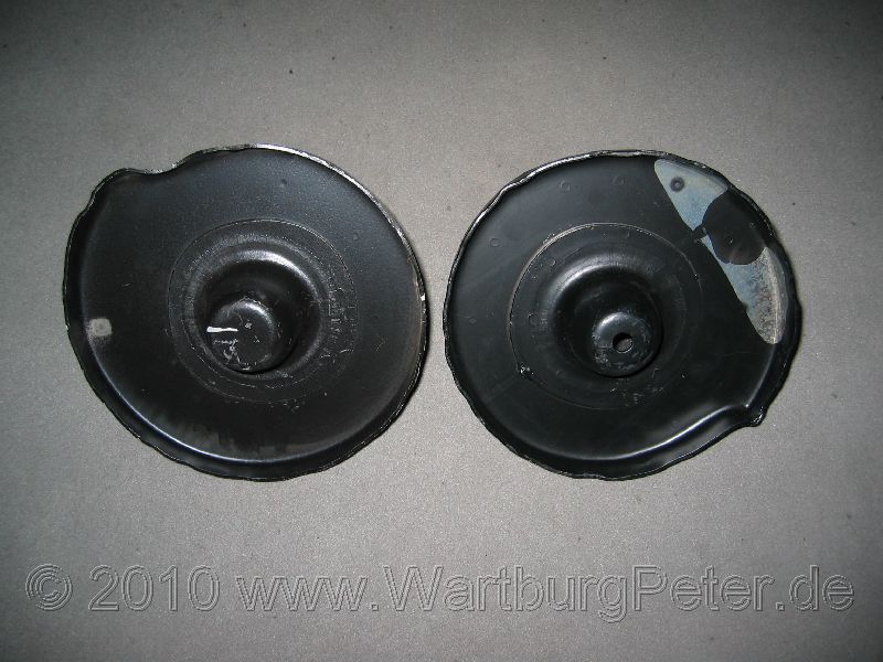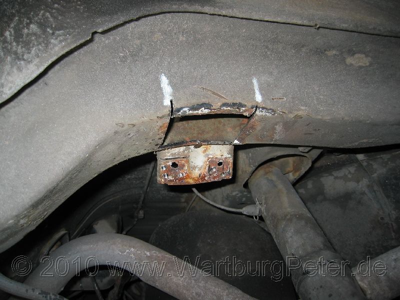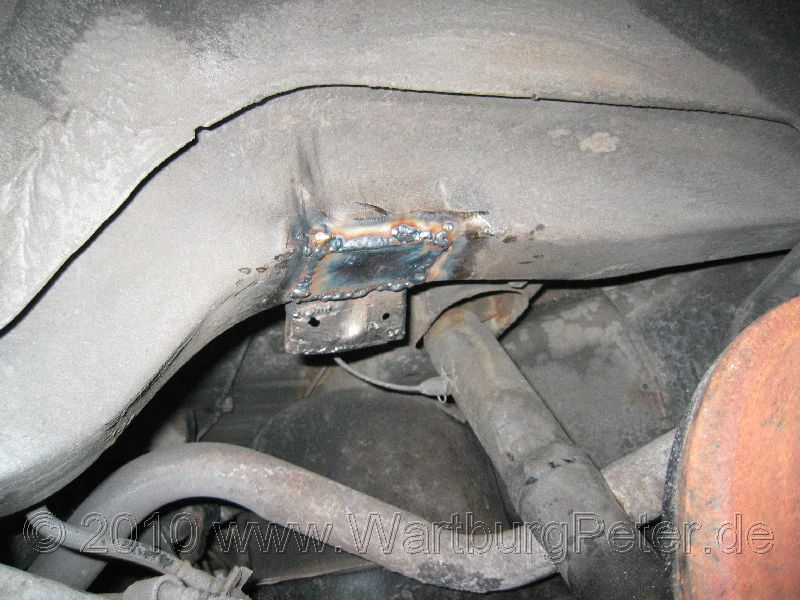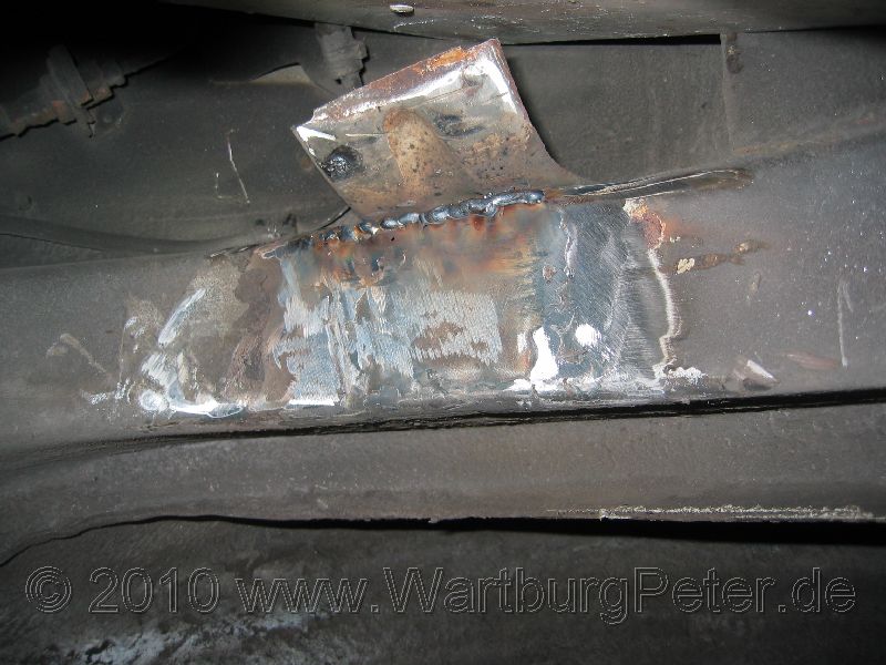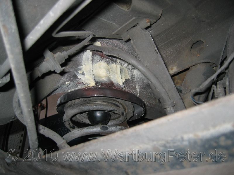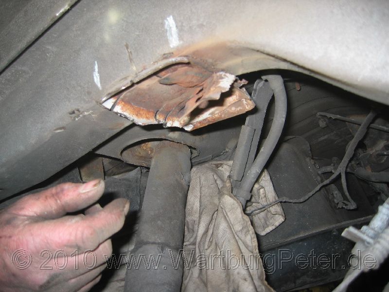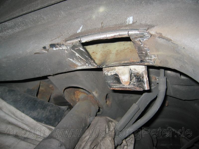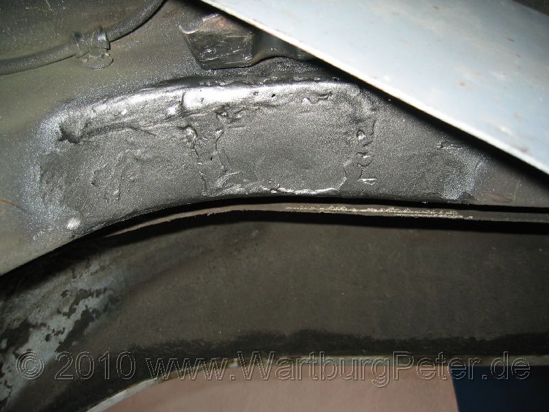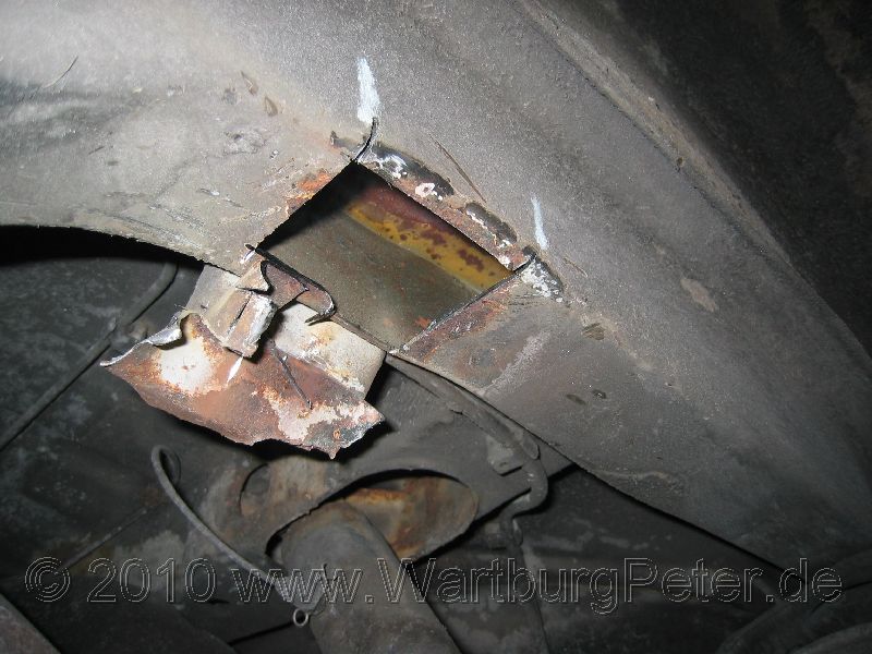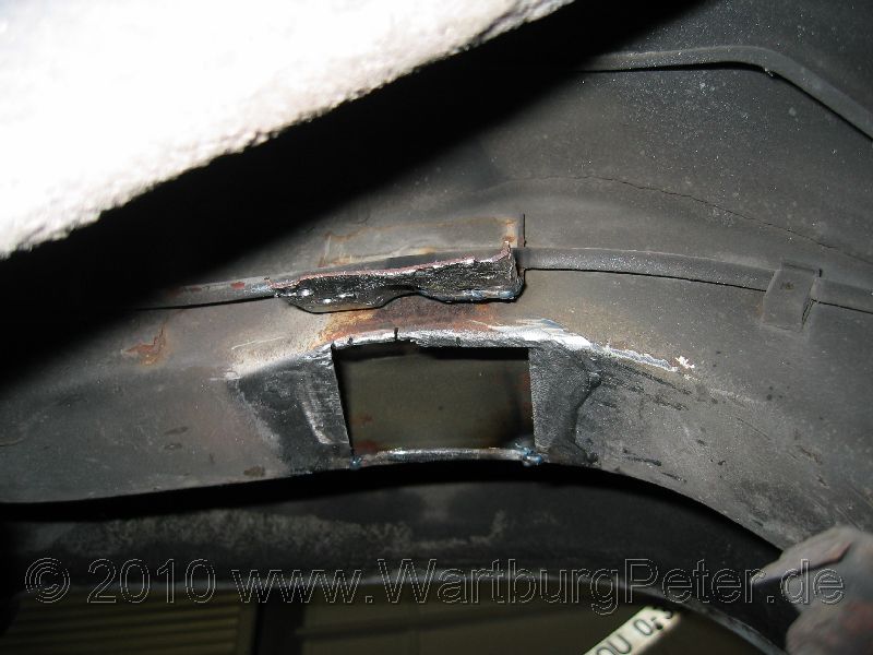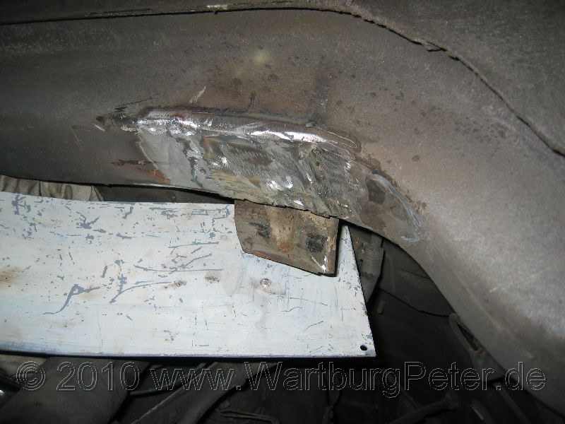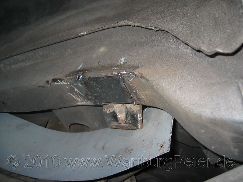 Das stehen gebliebene Stützblech vom Federteller ist gut zu erkennen. Nun wird das Loch mit einem passenden Stück Blech geeigneter Stärke verschlossen. Anschließend die Nähte schön verputzt.