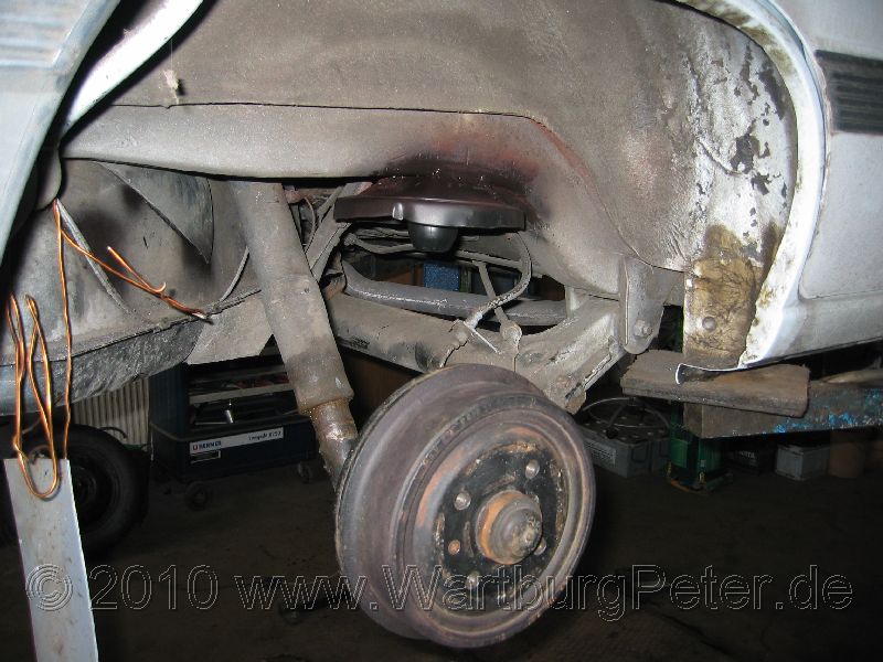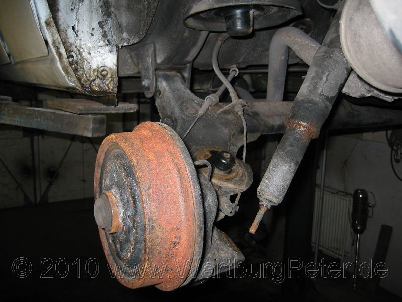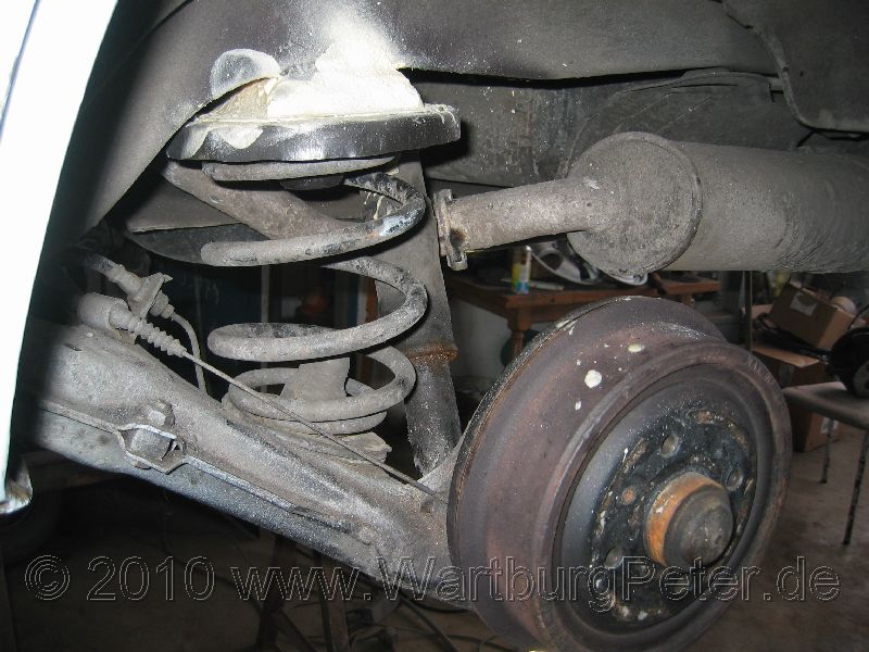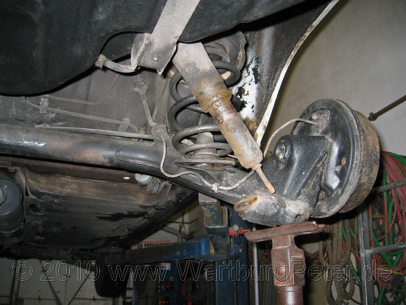 Die Hinterachse ist im ausgefederten Zustand abzustützen, dann können Stoßdämpfer gelöst werden. Obacht, daß die Bremsschläuche nicht belastet werden. Die Federn lassen sich leicht ohne Werkzeug entnehmen.