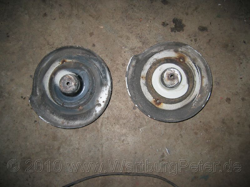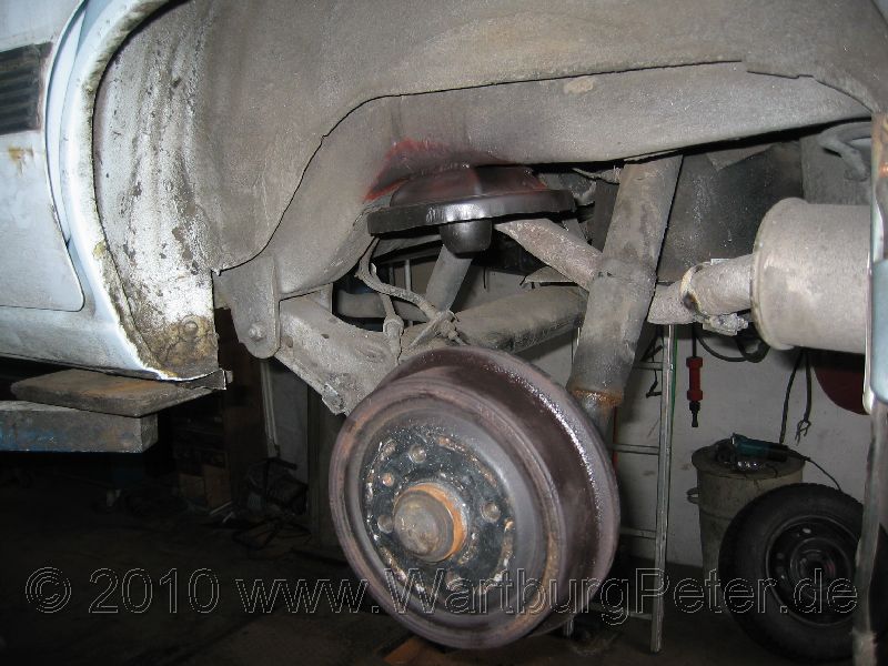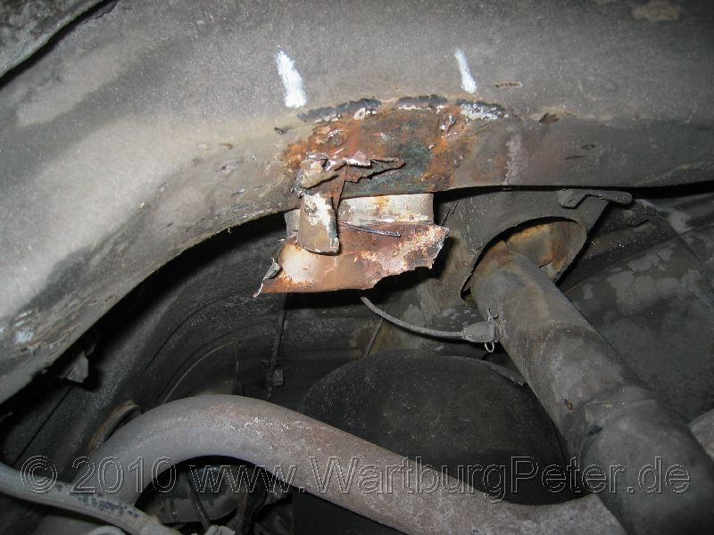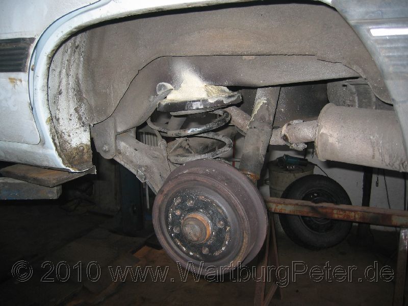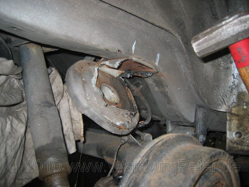 Die alten Federtöpfe werden mit Flex, Hammer und Meißel abgetrennt. Dabei zeigt sich, daß der Federtopf sicher noch viele Jahre durchgehalten hätte. Die Durchrostung ist minimal und betrifft den "Becher" über dem Federtopf. Das ist ein Tiefziehblech, an der vorderen Flanke etwas dünn gezogen. Aufgrund der Konstruktionsweise ist dort ab Werk kaum etwas konserviert.