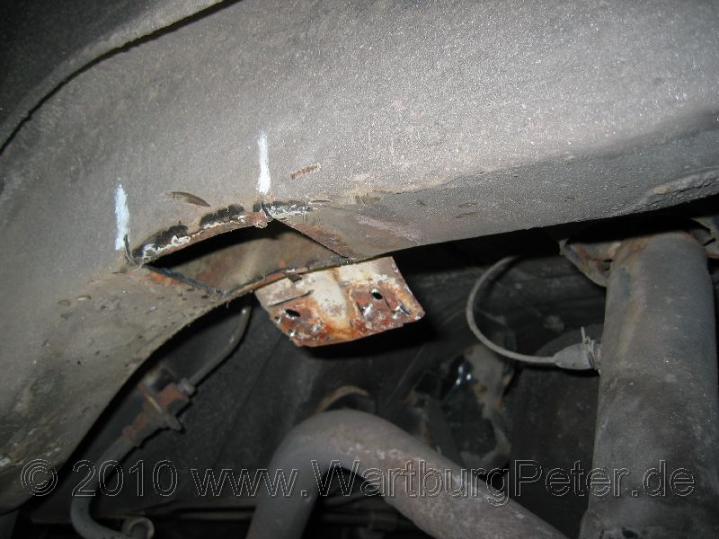 Dort, wo Blech auf Blech saß, hat der Rost ein kleines Loch in den Träger gefressen (jedoch nur auf der linken Seite). Also entschließen wir uns, gleich nach dem Rechten zu schauen und trennen den angerosteten Abschnitt heraus.