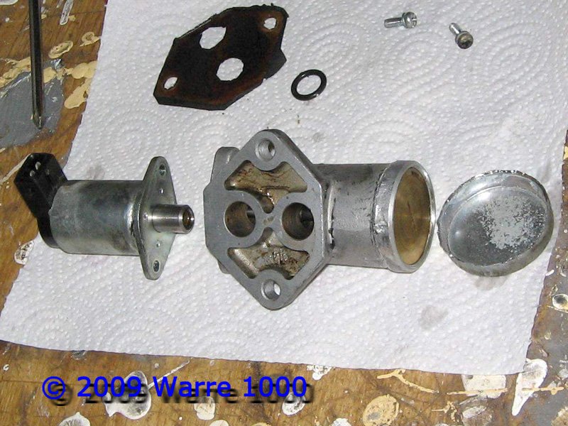 In meinem Opel befindet sich ein "Leerlaufmotor", verbunden mit der Drosselklappe. Im Bild ist links der Elektromotor zu sehen oder sind es nur ein Solenoid (eine Zylinderspule zum Erzeugen eines räumlich möglichst konstanten Magnetfeldes)? Ich weiß nicht. In der Mitte das Leerraufventil und rechts im Gehäuse eine größere Messingmutter (eigentlich nur eine Scheibe mit Gewinde). Unter der Messingscheibe gibt es eine Feder, die das Leerraufventil schließen soll, falls der Elektromotor nicht an die Ventilstange drückt. Bei mir wollte das Ventil nicht schließen. Wenn ich die Ventilstange etwas zog, konnte ich nicht mehr Luft durch das Ventil blasen. Also habe ich die Messingscheibe eine 1/4 Umdrehung nachgespannt. Dann sollte das Leerraufventil immer geschlossen sein.